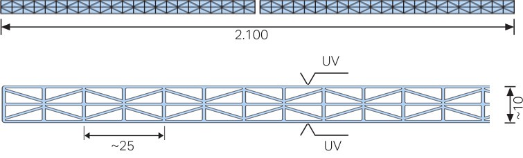 Újdonság a termékkínálatunkban a 10 mm-es lemezvastagság esetén az X struktúrás kialakítás. Az X struktúra előnye a némileg nagyobb osztóborda távolságból adódó tetszetősebb megjelenés. A kisebb terméksúly mellett a lemezek hasonló módon építhetők be, mint az 1,7 kg/m2 súlyú, klasszikus lemezeink. A Makrolon multi UV 5X/10-25 típus víztiszta színben és kétoldali UV védelemmel vásárolhatók meg.