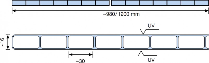A két kamrafalas, 16 mm vastag polikarbonát lapok a 30 mm-es osztóborda távolságnak köszönhetően egészen egyedi megjelenést biztosítanak a lemezeknek, ugyanakkor a vastagabb lemezekkel vetekedő terméksúly (3,6(!) kg/m2) extrém időjárás- és jégverésállóságot, valamint terhelhetőséget biztosít. A lemezek 20 év gyártói garanciája, és a két oldali UV védelemű lemezek jelenleg rendelésre, egyedi feltételek alapján érhető el.